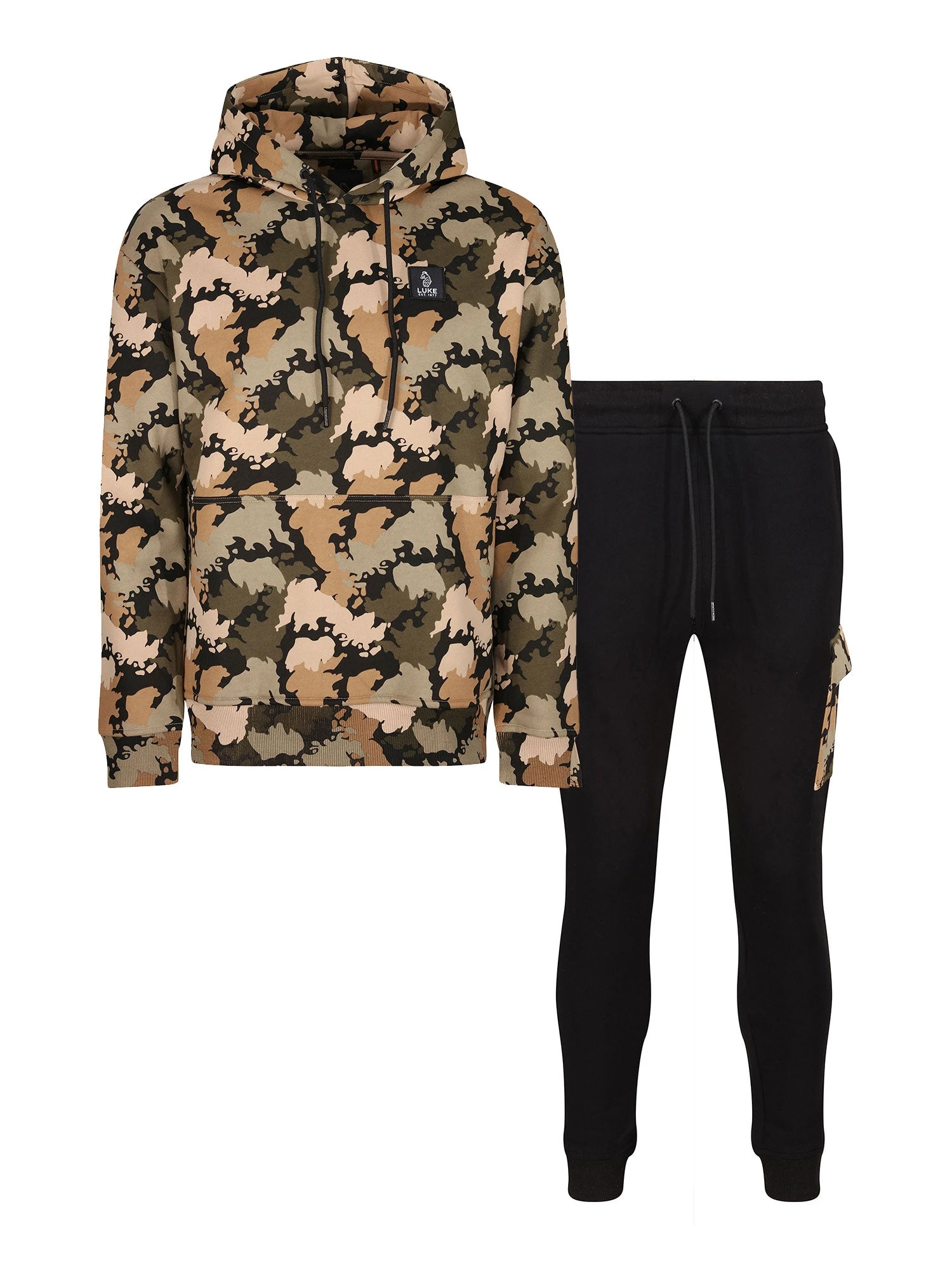 Create a bold look this season with this hoodie & joggers set from LUKE. British Goodland Camo printed hoodie is cut to a relaxed fit and constructed from a comfy cotton blend. It features a cut and sew lower front panel and two handy side pockets. Joggers are crafted from a soft cotton fleece back- they are sure to keep you feeling cosy. The side leg pockets feature the camo print, and they are fitted with a comfy drawcord waist and handy zip pockets, perfect for all your essentials. The look is then signed off with the brand’s iconic LUKE EST. 1977 woven badges.