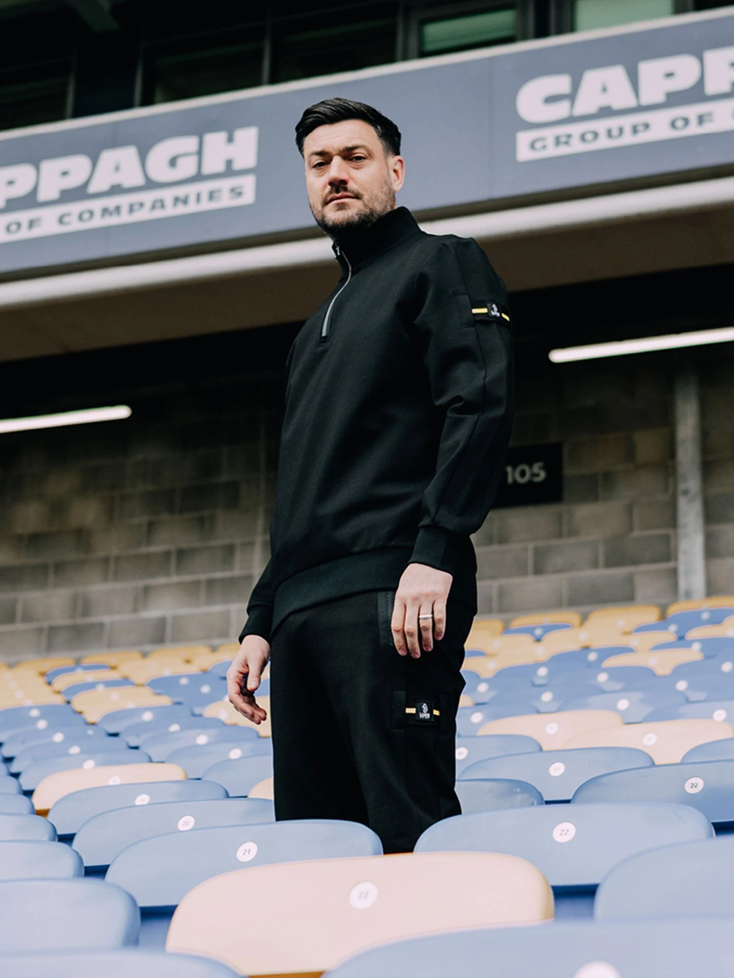 Sweat features a stylish front quarter zip. The left sleeve features an AFC Wimbledon black and yellow striped detachable tape detailed with the brand’s iconic LUKE EST. 1977 woven badge and the right is styled with a zip pocket which is complete with a raised rubber print of the AFC Wimbledon crest.