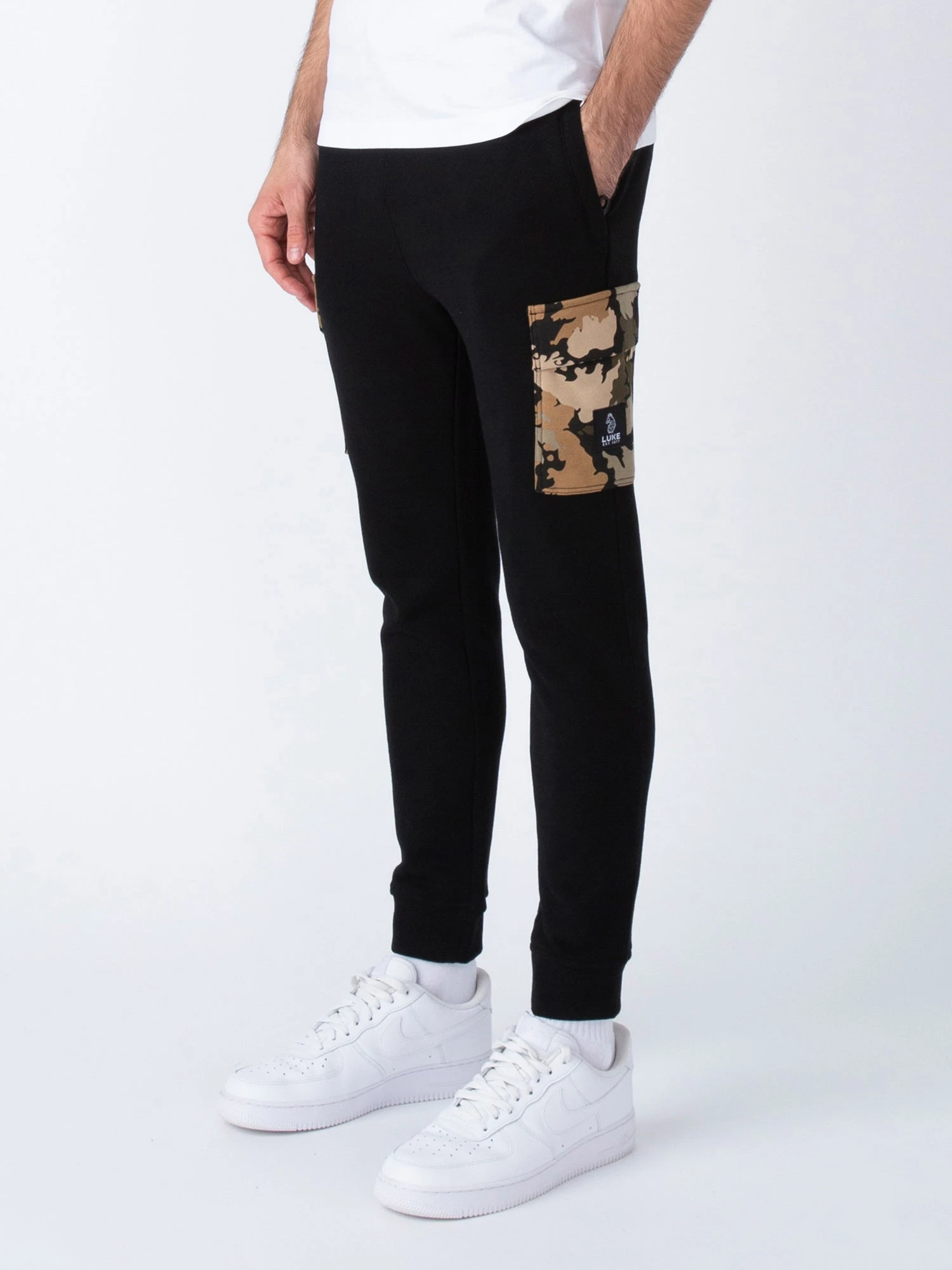Create a bold look this season with these joggers from LUKE. Crafted from a soft cotton fleece back- they are sure to keep you feeling cosy. The side leg pockets feature the British Goodland Camo print, and they are fitted with a comfy drawcord waist and handy zip pockets, perfect for all your essentials. The look is then signed off with the brand’s iconic LUKE EST. 1977 woven badge.