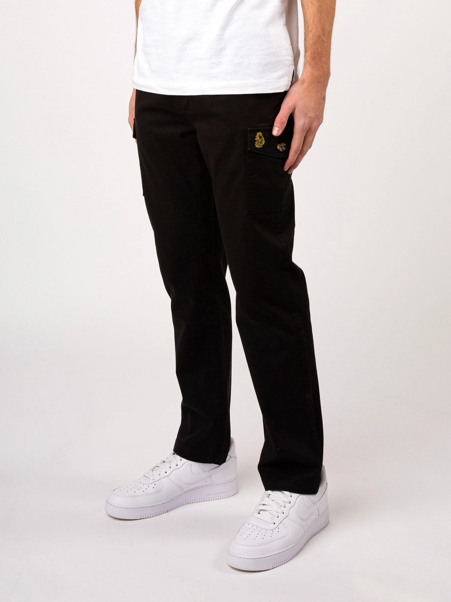 LUKE takes a utilitarian approach this season with these ankle fit cargo trousers. Crafted from a durable cotton twill, they come equipped with a multitude of pockets and feature an elasticated waistband which ensures perfect fit and comfort. The brand’s iconic lion head embroidery sits on the left leg pocket to finish the look.