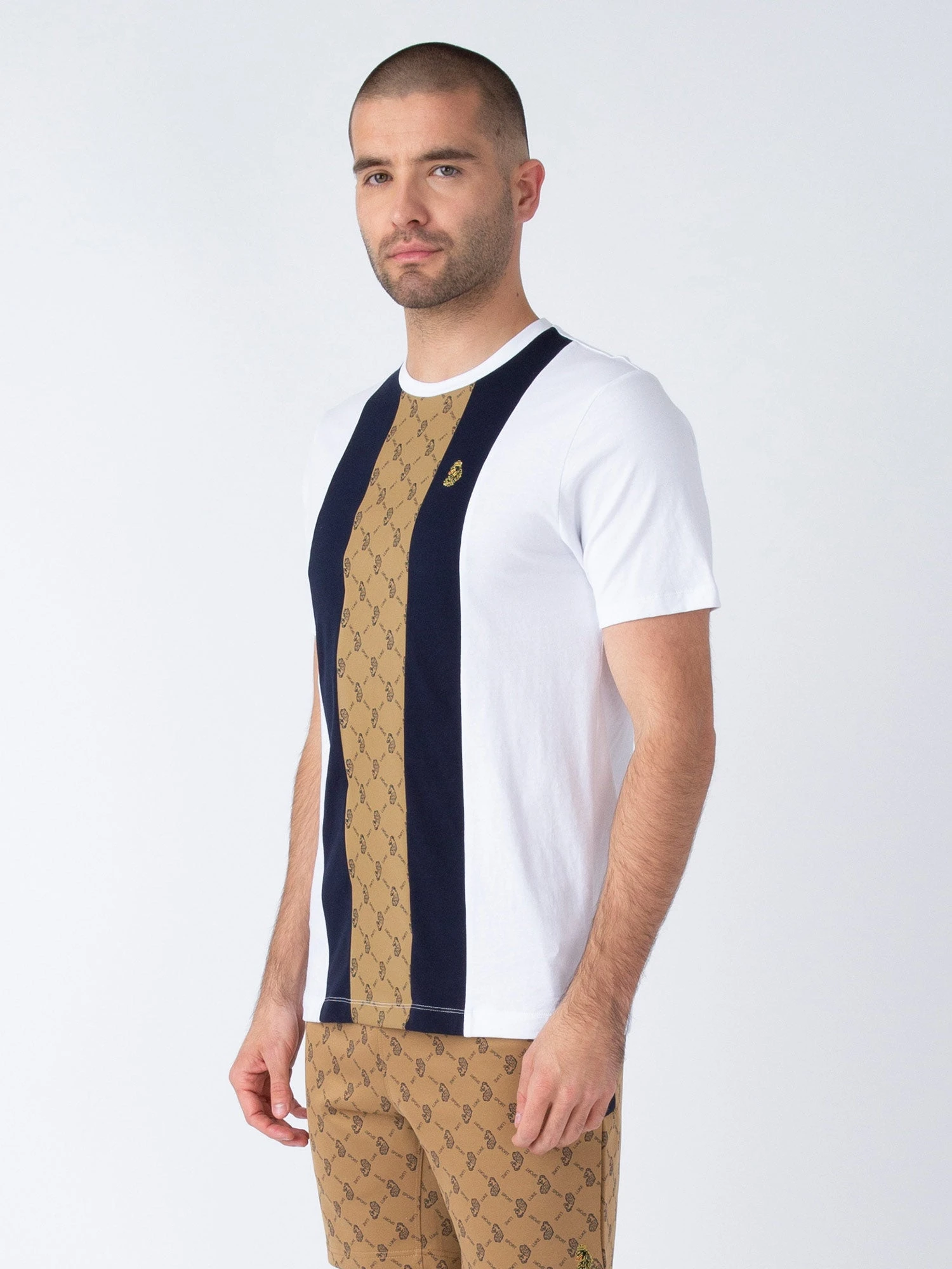 This classic crew neck t-shirt from LUKE is cut from pure cotton jersey and features contrast cut and sew vertical panels, the centre panel features the LUKE SPORT over print. It has a soft rib neck for maximum comfort and is complete with the brand’s iconic lion head embroidery on the left chest.