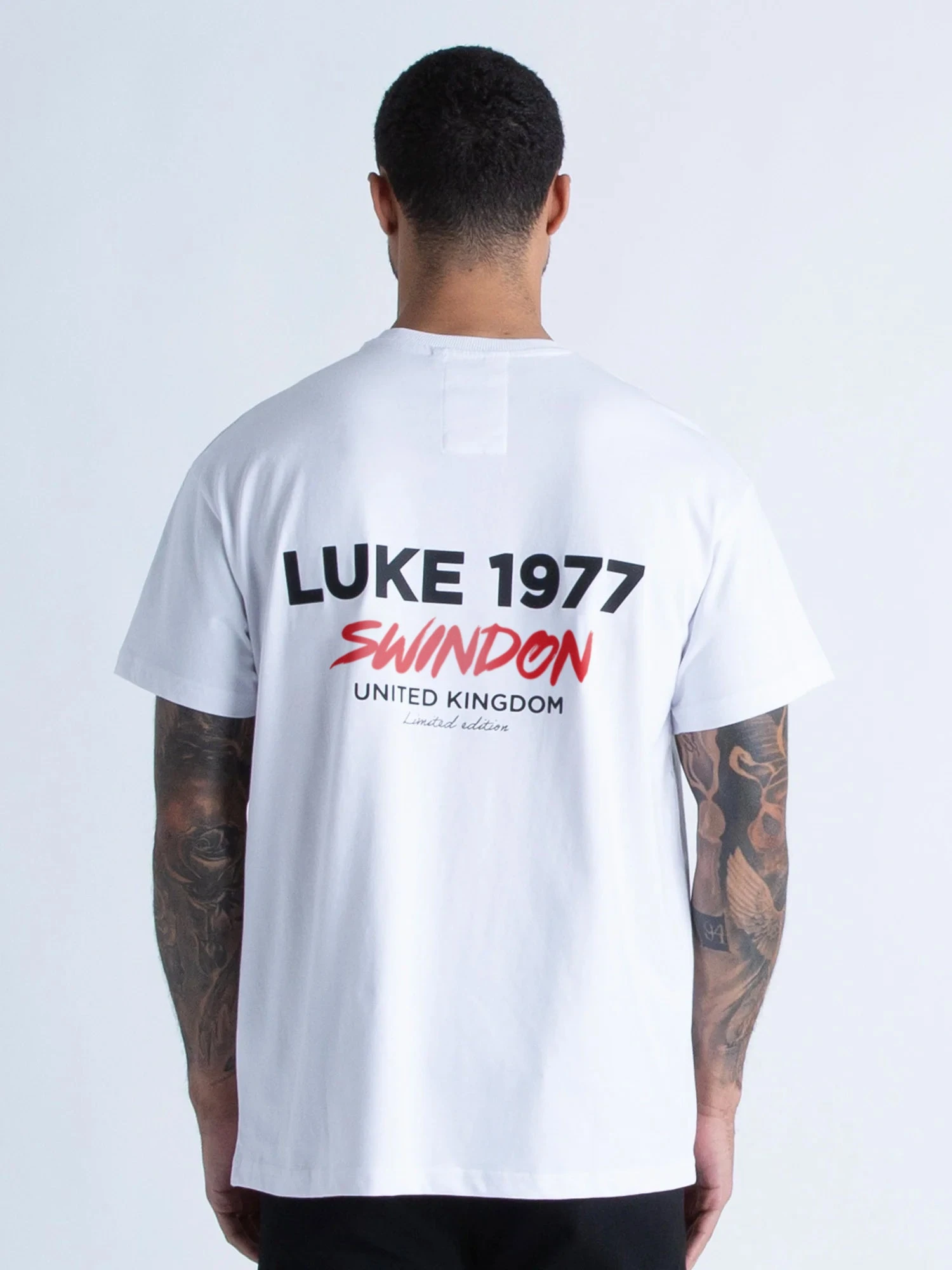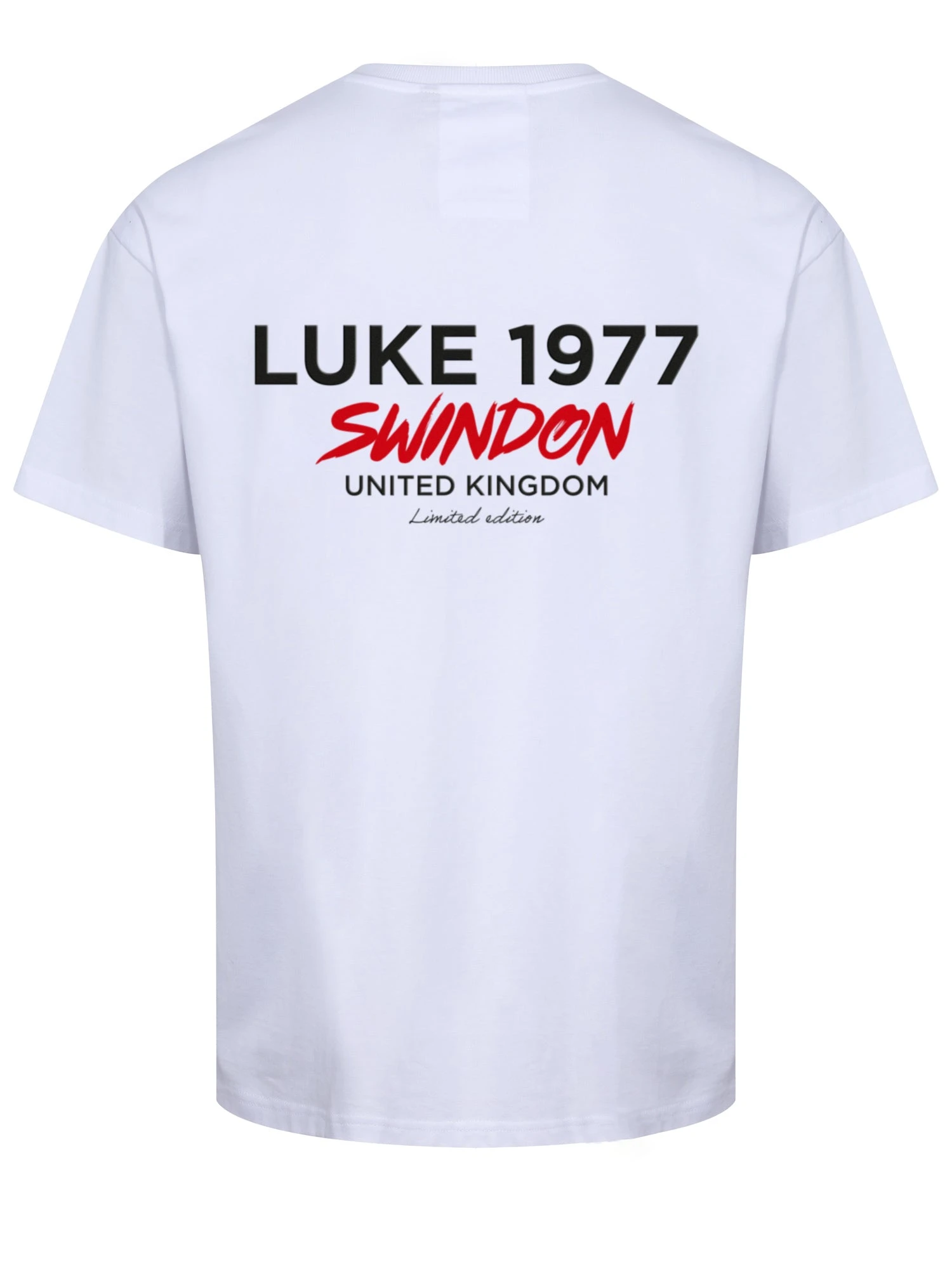 - Raised LUKE EST. 1977 graphic with a contrast Swindon print