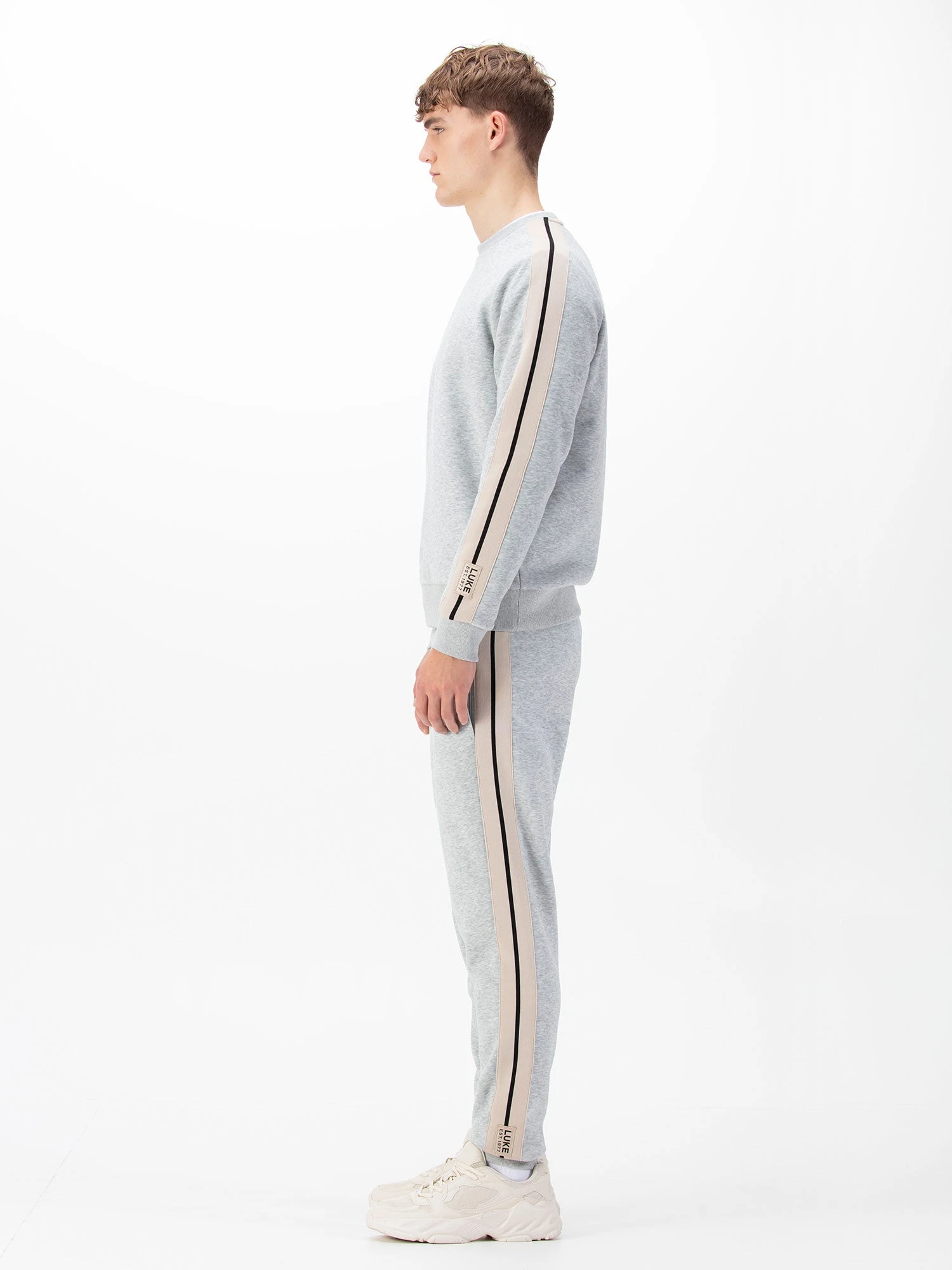 Upgrade your casual wardrobe essentials with this luxury sweatshirt & joggers tracksuit from LUKE. It is constructed from our premium vintage tricot fabrication and features vintage trim tape down each sleeve and leg. Joggers feature a comfy drawcord waistband and handy zip pockets. The look is then complete with the brand’s iconic LUKE EST. 1977 woven badge on the left sleeve and left leg.
