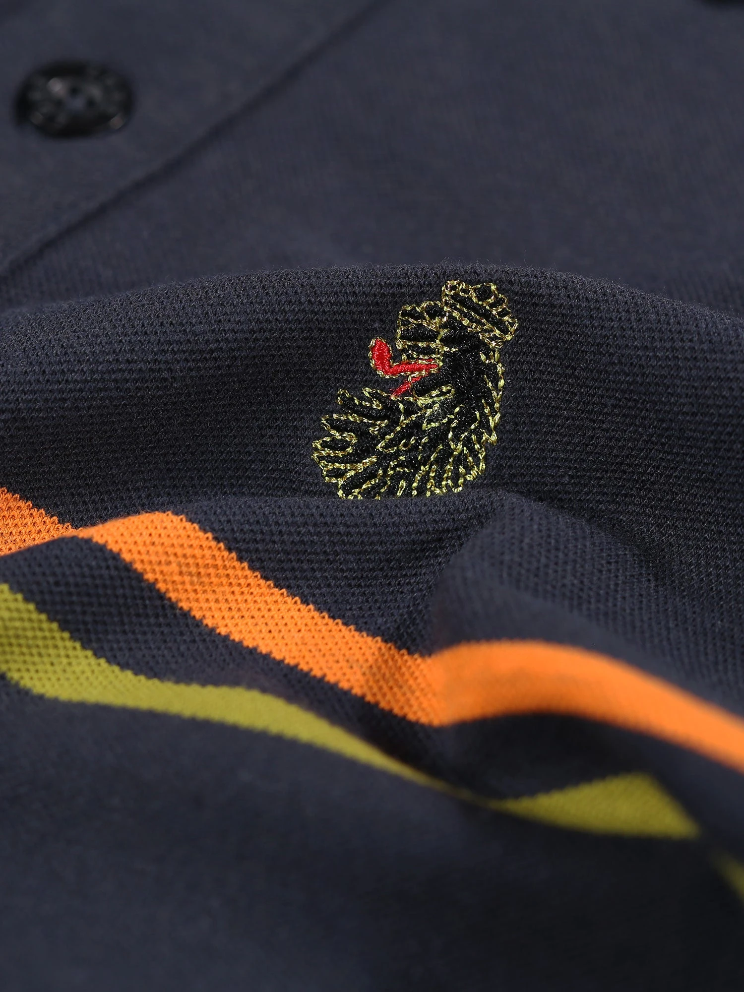 - Contrast yarn dyed chest stripes