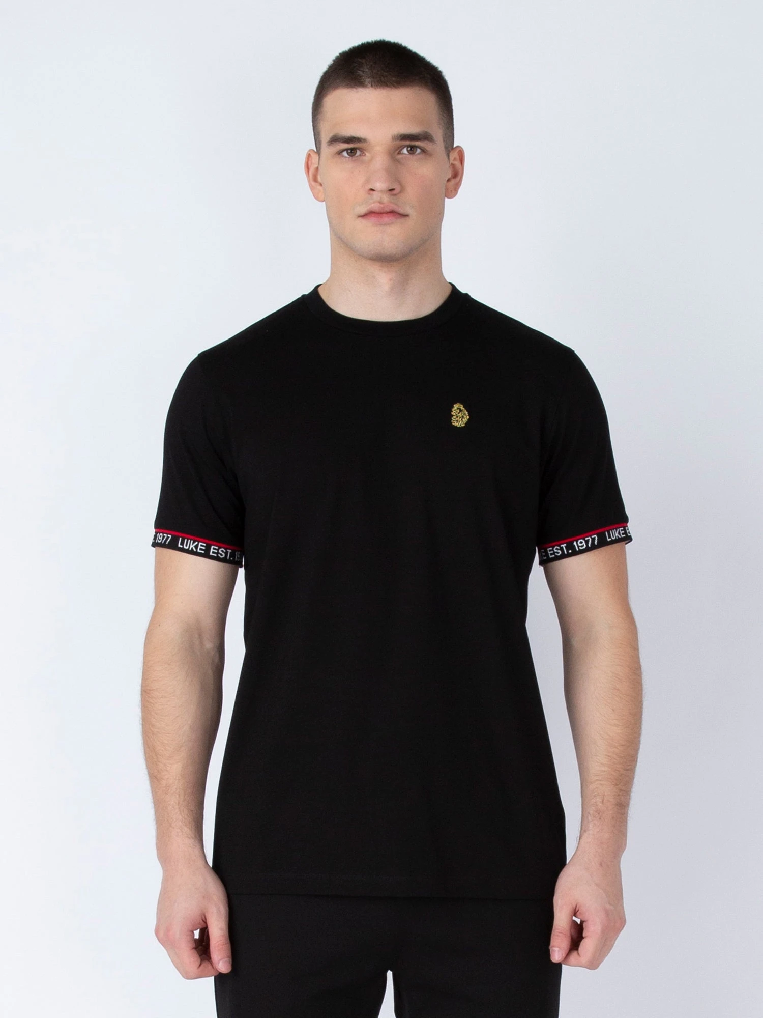 This stylish black tee from LUKE is your go-to this season. Constructed from a luxury cotton blend, it is fitted with a soft rib crew neck and rib cuffs which feature the LUKE EST. 1977 printed text in white and a contrast red stripe. The look is then signed off with the brand’s iconic lion head embroidery on the left chest.