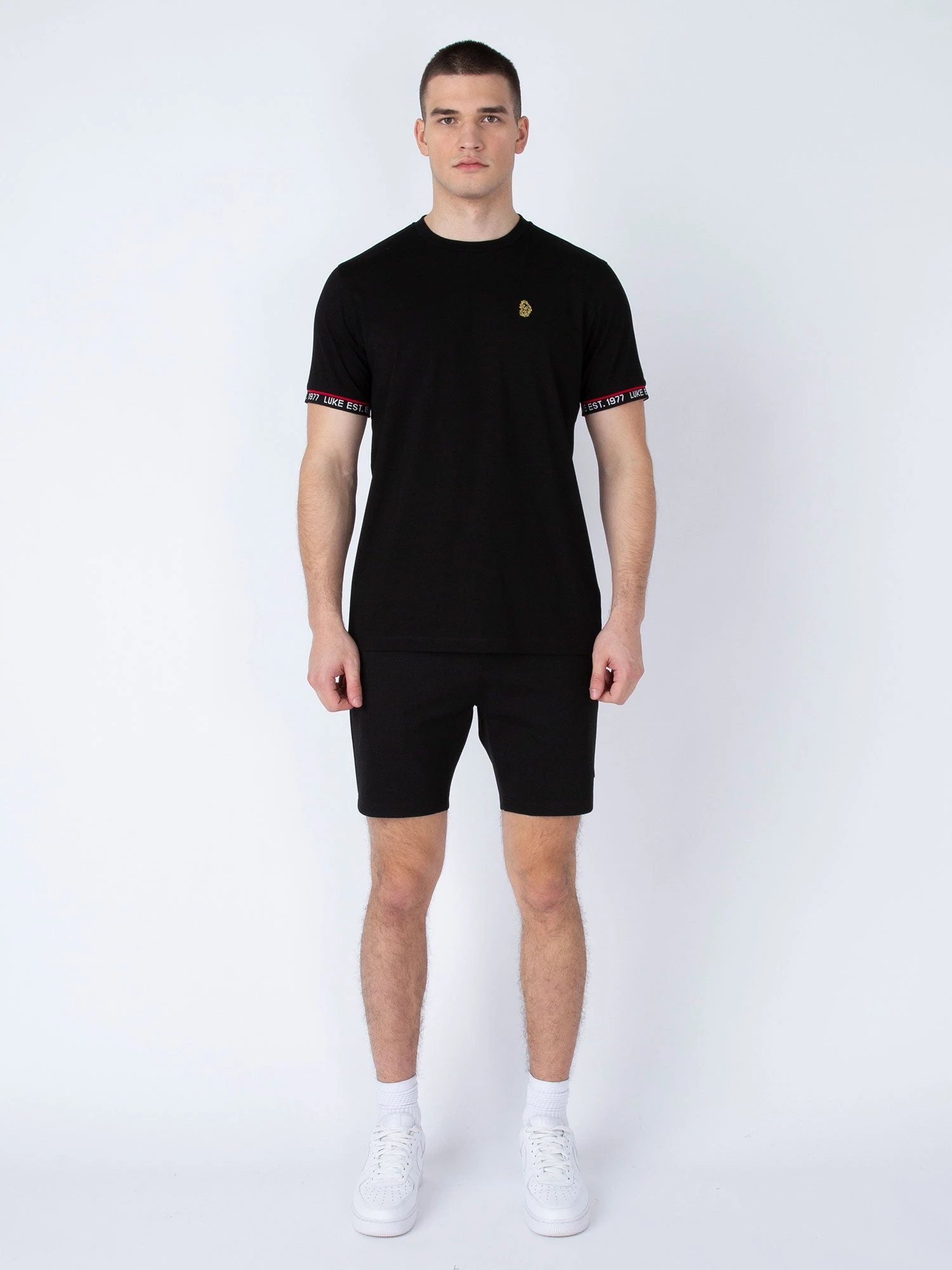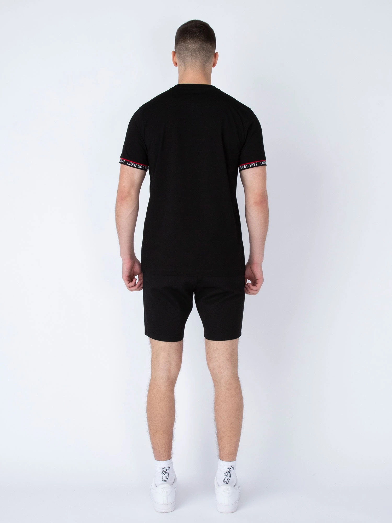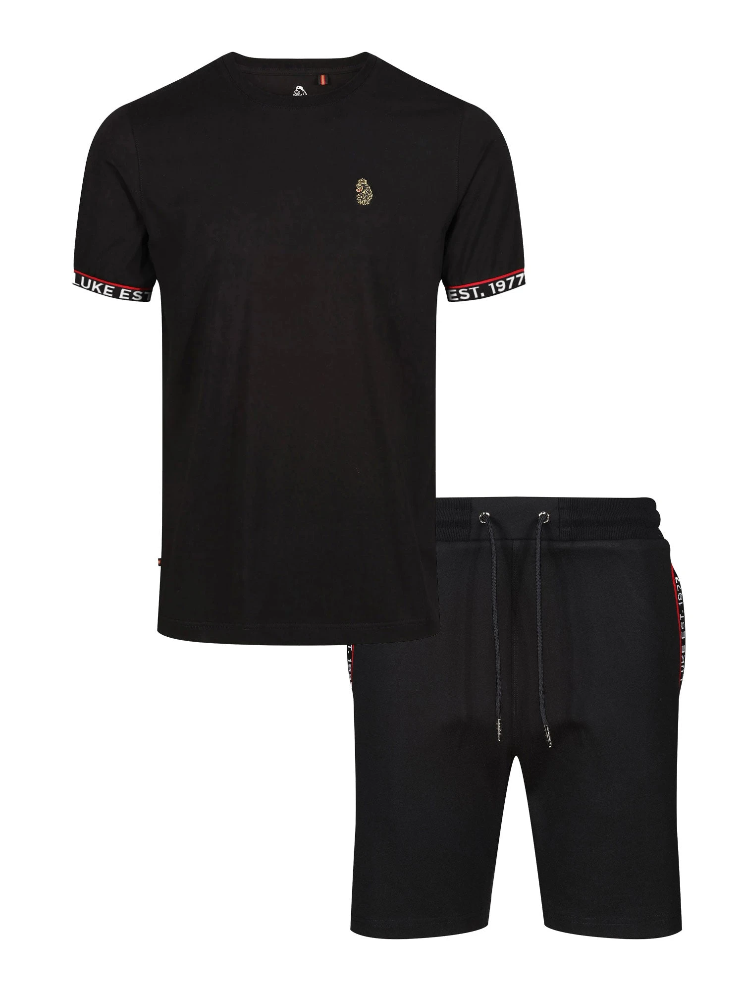 This stylish black tee & shorts set from LUKE is your go-to this season. T-shirt is constructed from a luxury cotton blend, it is fitted with a soft rib crew neck and rib cuffs which feature the LUKE EST. 1977 printed text. Shorts are cut from a premium interlock fabrication, they’re fitted with a comfy drawcord waist and handy zip pockets. They are detailed with chrome metal trims throughout and rib pocket welts which feature the LUKE EST. 1977 printed text. The look is then signed off with the brand’s iconic lion head embroidery on the left chest and left leg.