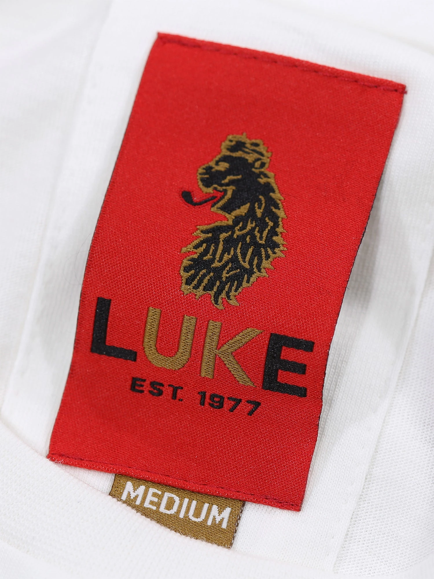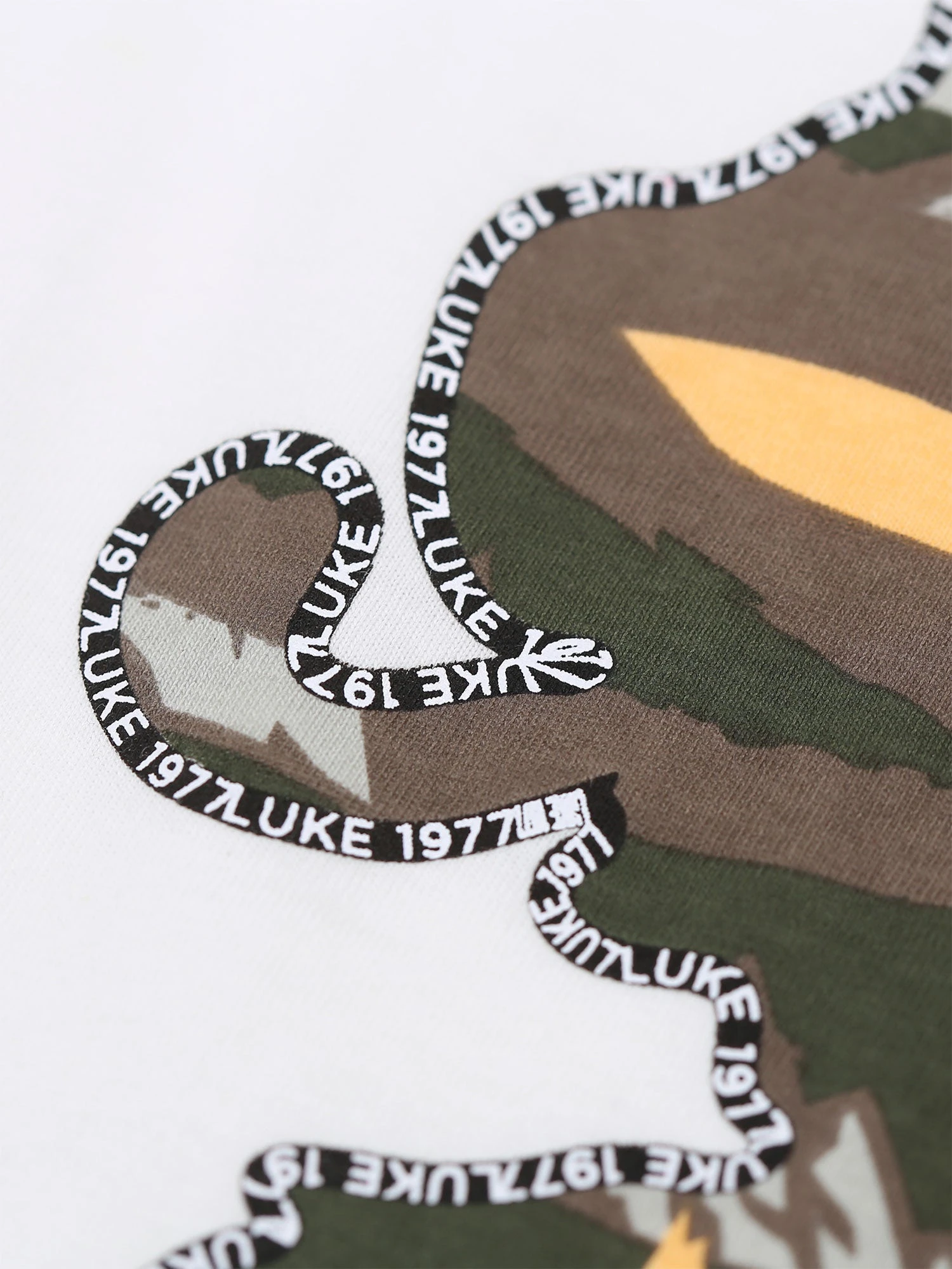- Woodland inspired camo print lion head outlined with a LUKE 1977 black/white text print